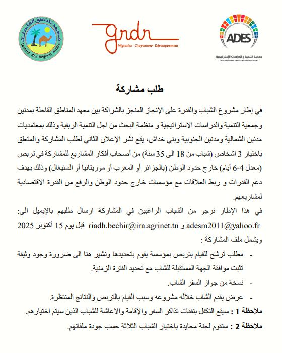 Dans le cadre du projet « Jeunesse, et pouvoir d’agir », mis en œuvre en partenariat entre l’Institut des Régions Arides de Médenine (IRA-LESOR), l’Association de Développement et des Études Stratégiques (ADES), et le Groupe de Recherche pour le Développement Rural (GRDR), un appel à participation est lancé à l’intention des jeunes des délégations de […]