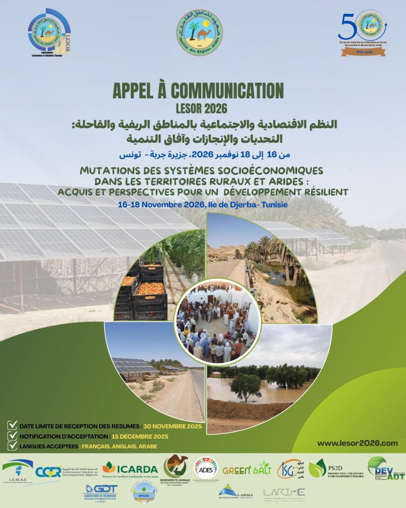 Le colloque international LESOR 2026, qui se tiendra du 16 au 18 novembre 2026 sur l’Île de Djerba (Tunisie), lance un appel à communication autour du thème : « Mutations des systèmes socioéconomiques dans les territoires ruraux et arides : acquis et perspectives pour un développement résilient ». Cet évènement vise à réunir chercheurs, experts […]